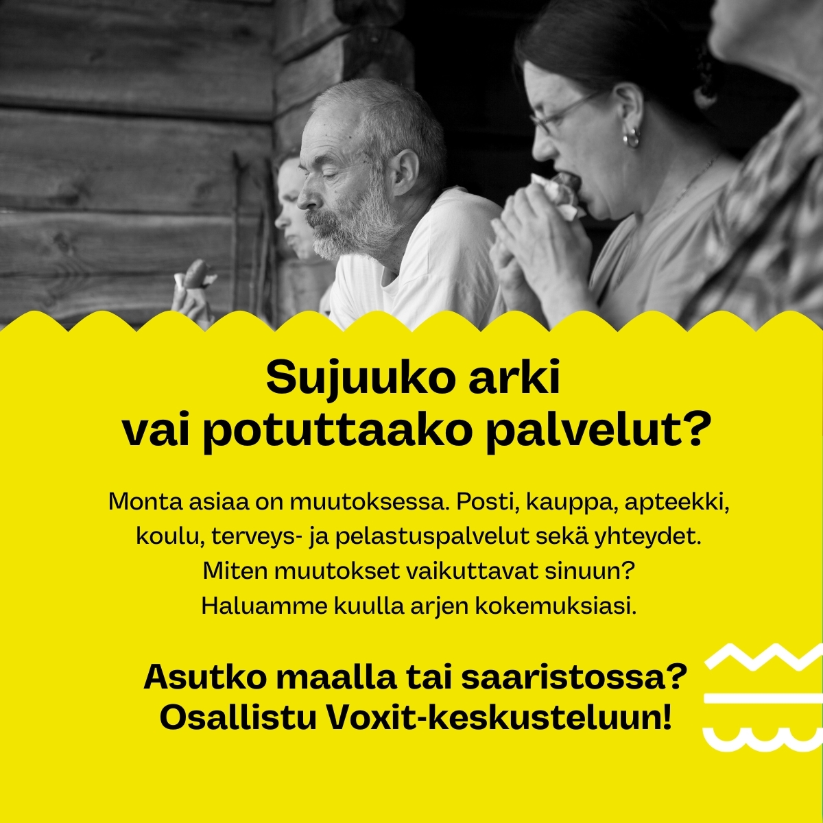 Sujuuko arki vai potuttaako palvelut Voxit-keskustelussa osallistujilla on mahdollista tuoda esille minkälaisia vaikutuksia palveluiden muutoksista näkee ja kokee juuri tässä hetkessä arjessa, työssä, yrittäjyydessä ja yhdistystoiminnassa maaseuduilla ja saaristossa. Keskustelun tuloksia hyödynnetään suoraan maaseutu- ja saaristopoliittisessa työssä.